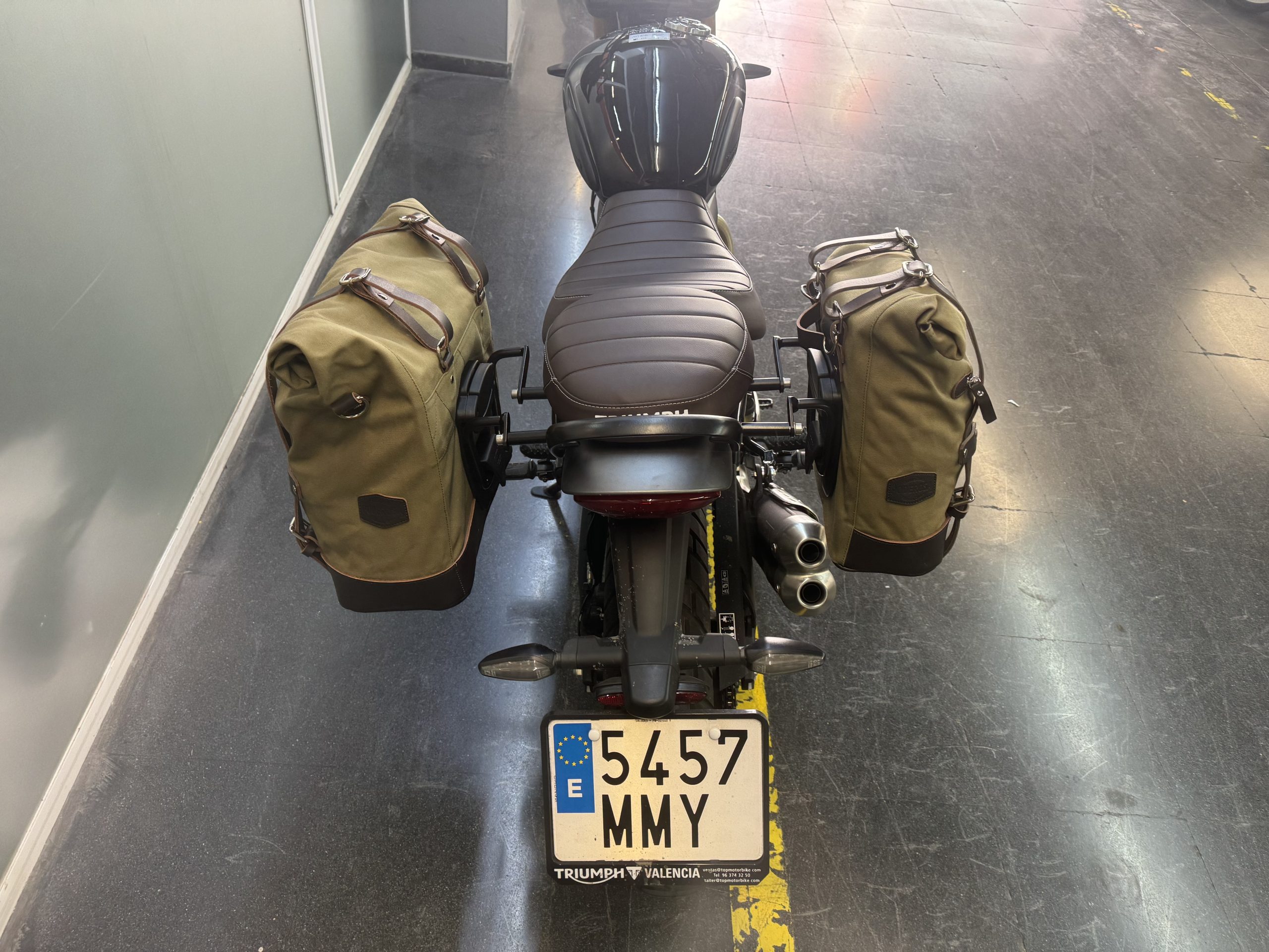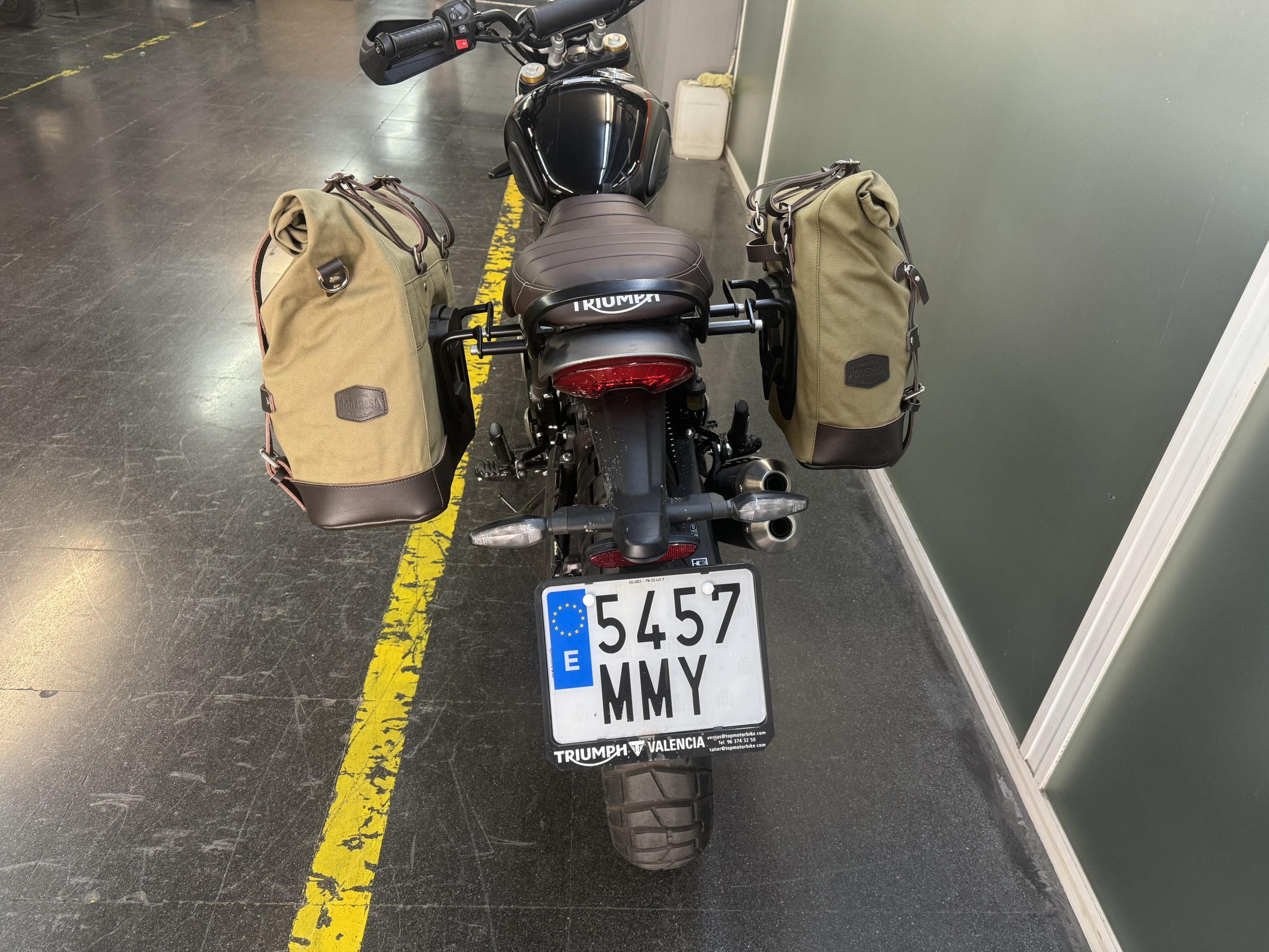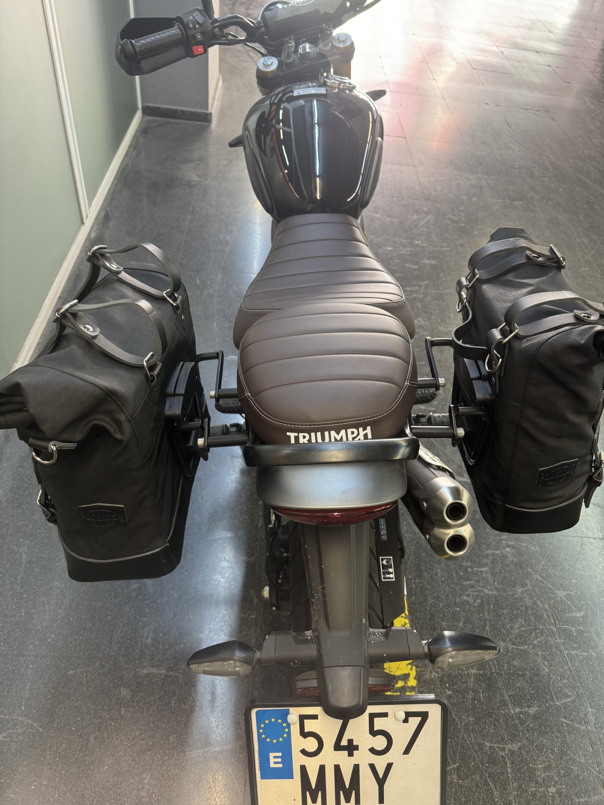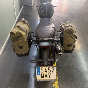 Wir empfehlenunsere Dakhla-satteltasche auf der rechten Seite des Auspuffs.