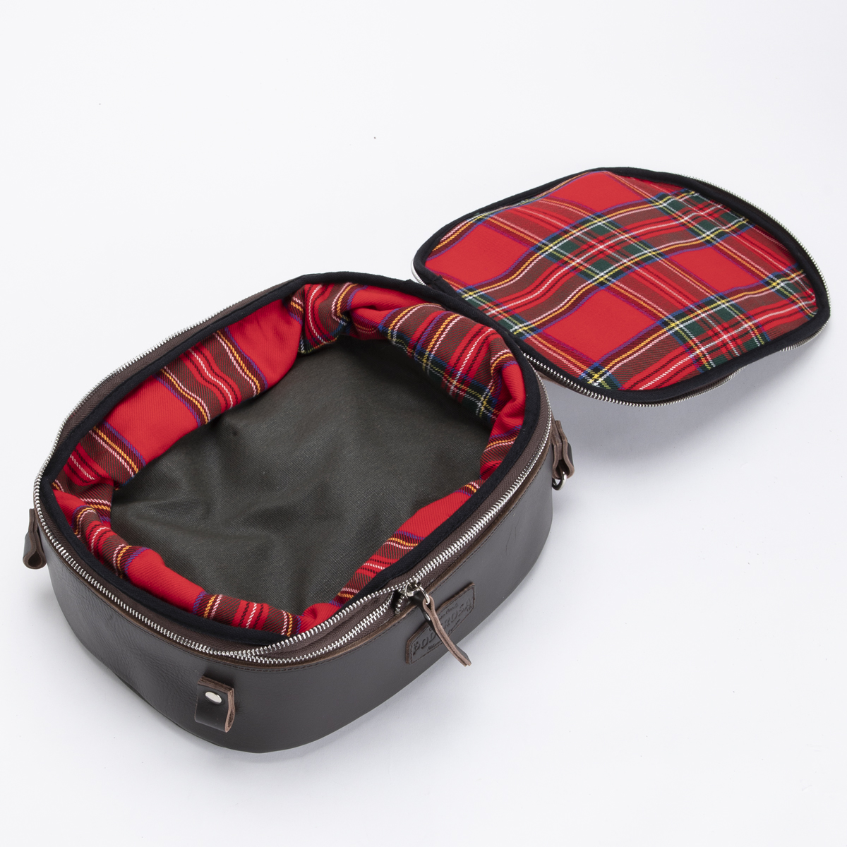Couleur Safari Beige (avec finitions en cuir marron foncé). Doublure tartan rouge.